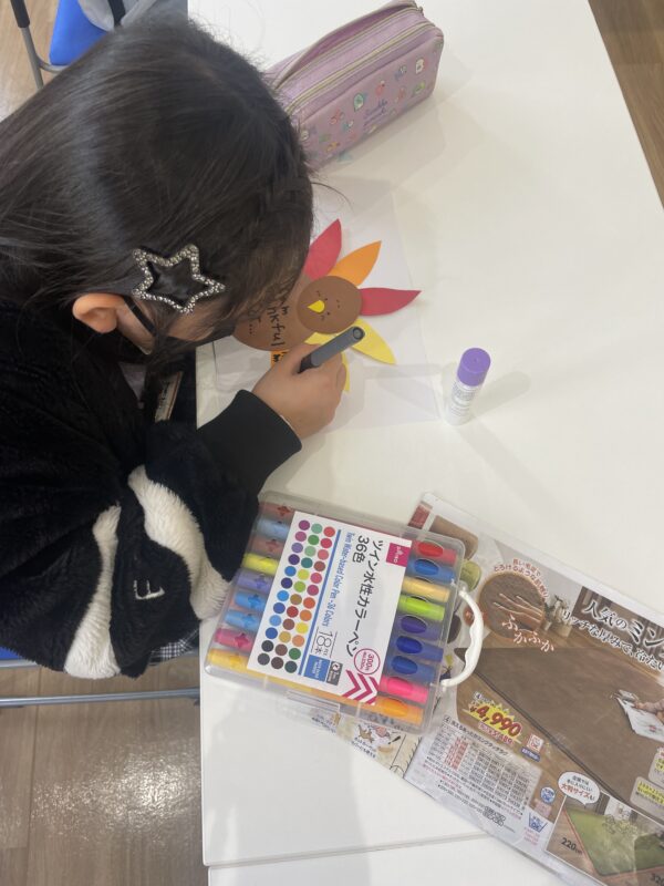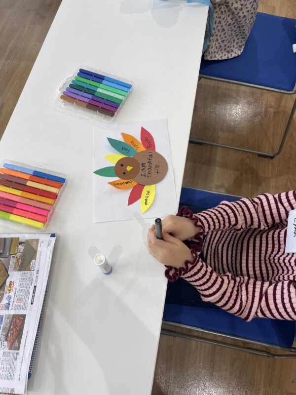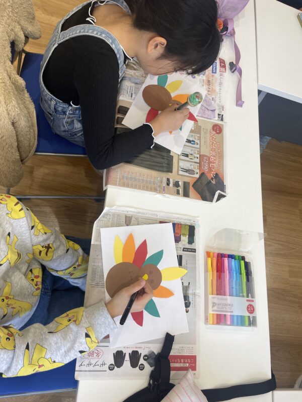 工作ではターキーのThanksgiving cardを作りました。カラフルの羽の部分には感謝しているものを書きました。