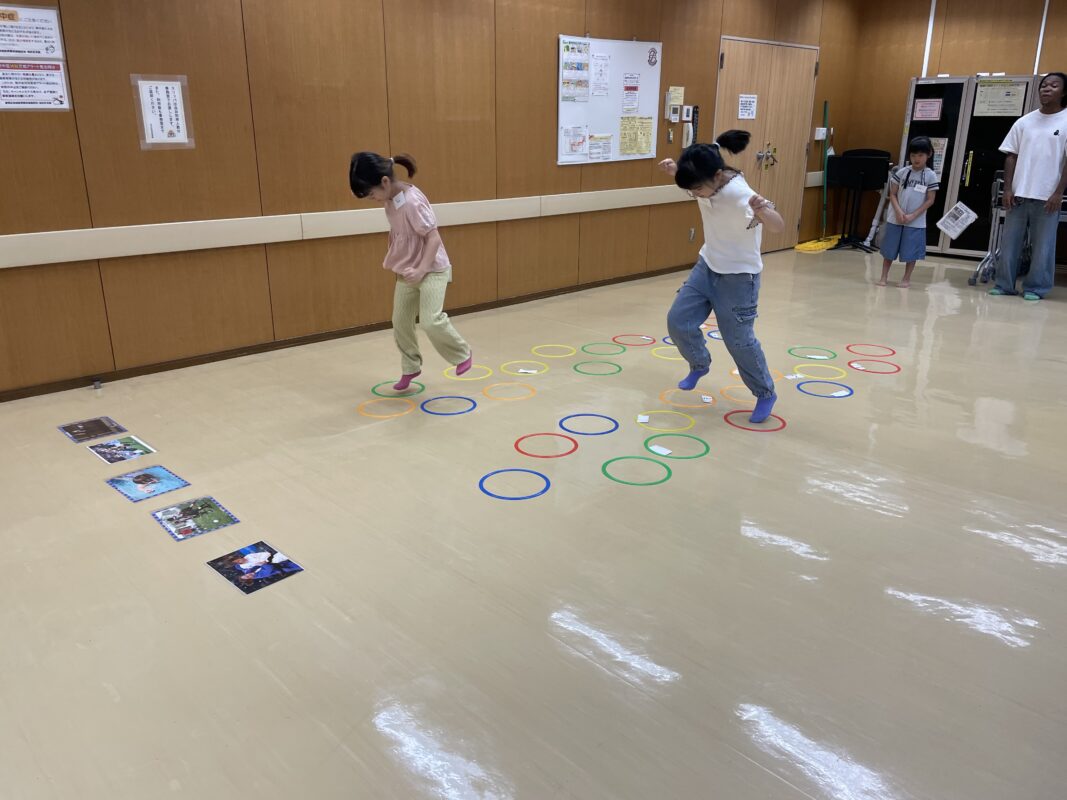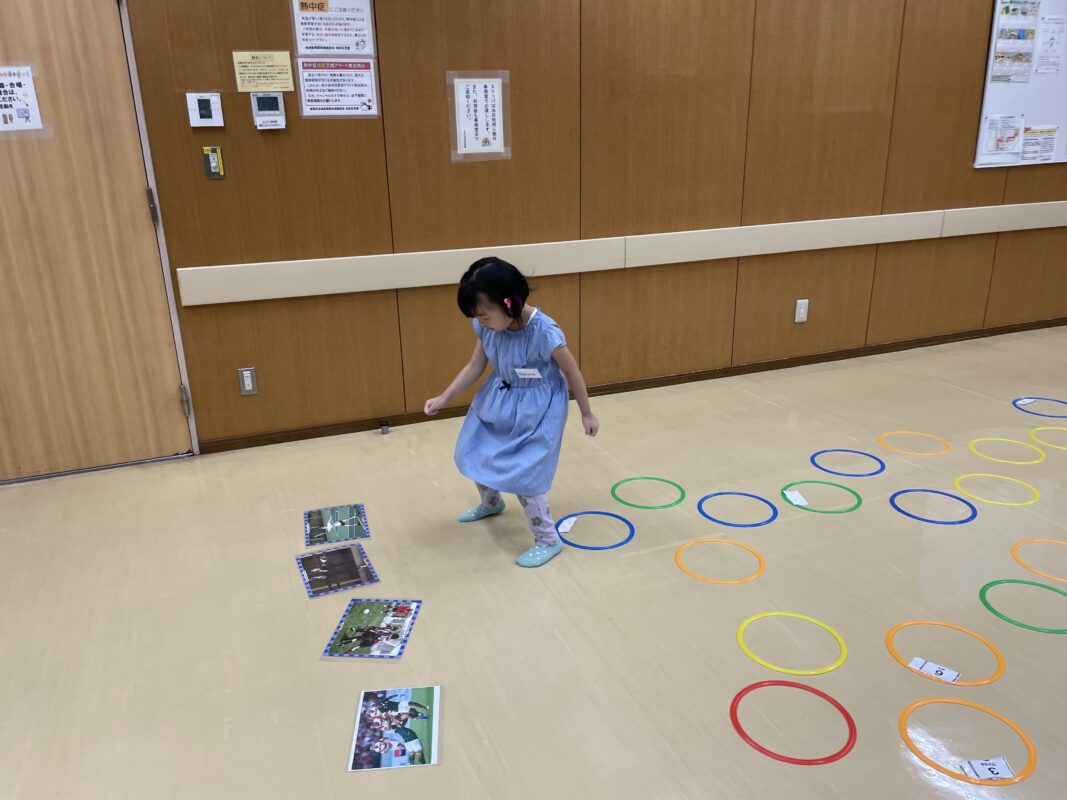 コースはhopscotch(けんけんぱ)→カードを1枚選んでジェスチャーをしながら単語を英語で言う→shooting(ボール当て)→balloon hop(ボールを足に挟んでジャンプ)→カードを1枚選んでジェスチャーをしながら単語を英語で言う→次の人にタッチです。